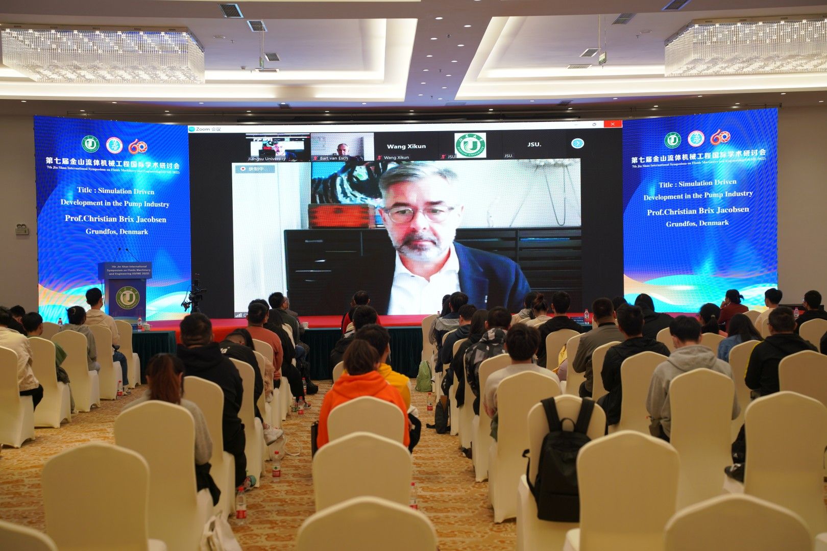 学术讲座环节由法国科学院骑士勋章获得者Gerard Bois教授主持。韩国仁荷大学Kwang-Yong Kim教授、52AV 王希坤教授、荷兰埃因霍温理工大学B.P.M. Van Esch教授、丹麦格兰富公司仿真技术总监Christian Brix Jacobsen教授,分别以几何效应对蜗壳式离心泵内部不稳定流动特性的影响、圆柱绕流的流动干涉机理及涡激振动研究、水泵站及水轮机过鱼损伤评估研究、水泵行业的仿真驱动发展为主题进行了精彩的专题报告。