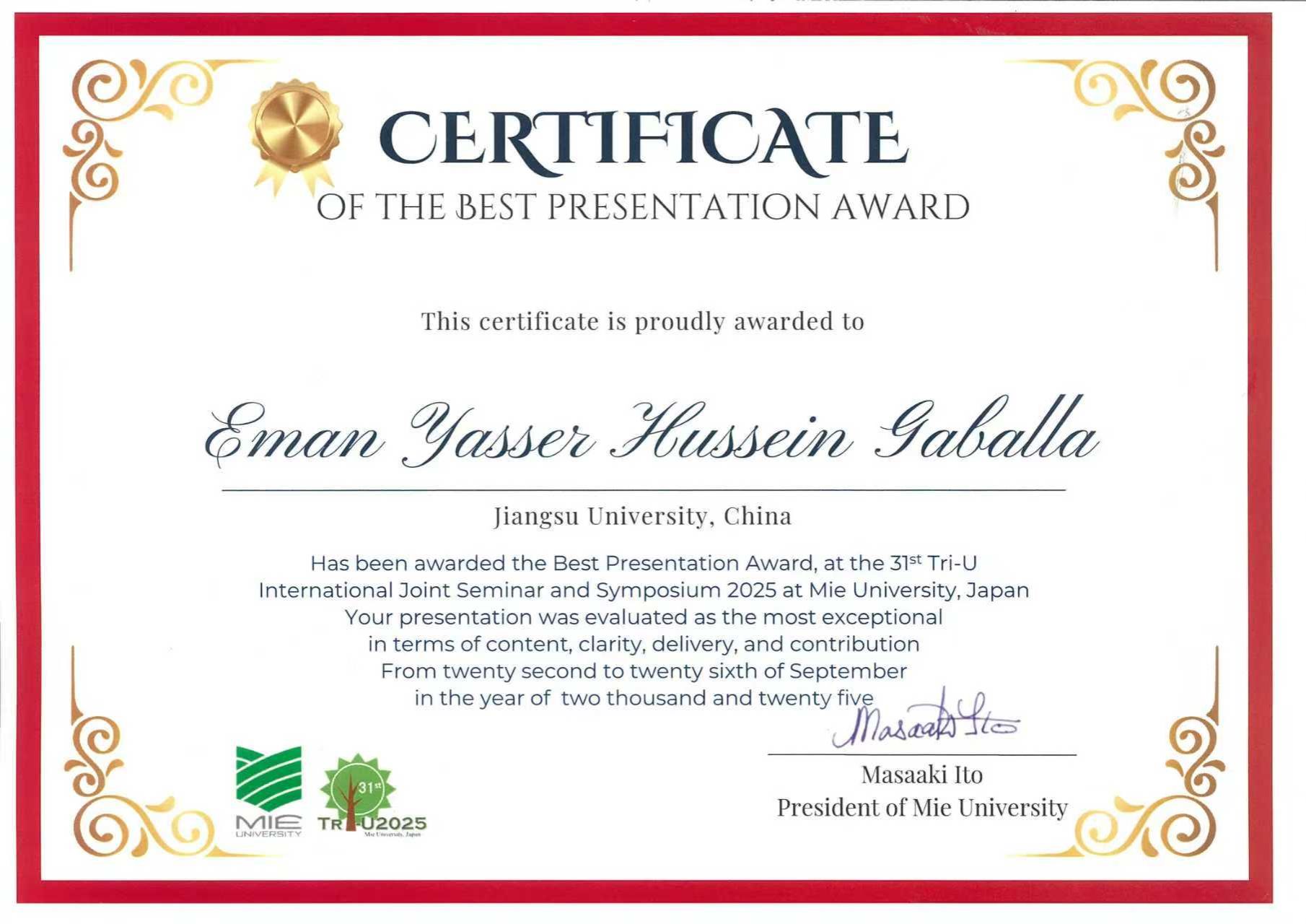 52AV 留学生EmanYasser通过单位推荐、资格审查、论文评审、综合面试等层层选拔,作为2名来华留学学历研究生代表之一赴日本参会,并经激烈角逐,获得本次学术研讨会最高荣誉“大会最佳汇报奖”。