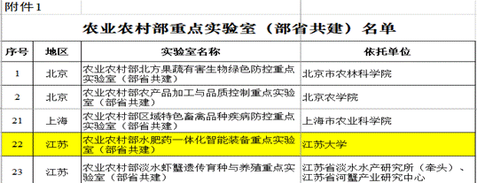 Recently, Notice on the Name List of the Key Laboratory of the Ministry of Agriculture and Rural Affairs was issued by Ministry of Agriculture and Rural Affairs (MARA) of the People’s Republic of China, in which 80 key laboratories of MARA were selected. The Key Laboratory of Water, Fertilizer and Medicine Integration Intelligent Equipment of MARA led by Prof. Li Hong was approved, which was the only approved key laboratory of MARA of Jiangsu Province in 2022.