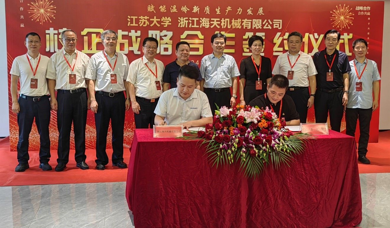 Following the Party-building event, a strategic cooperation signing ceremony between Jiangsu University and Zhejiang Sea & Sky Machinery Co., Ltd. took place. This marks Jiangsu University's first cooperative project in the agricultural machinery sector in Wenling, further expanding its collaboration in the area of industry-university-research cooperation.